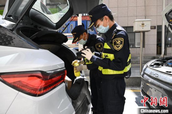 5月25日,在西藏自治區(qū)日喀則市吉隆縣的吉隆口岸,海關(guān)工作人員在對出口的國產(chǎn)新能源汽車進(jìn)行檢查。中新社記者 貢嘎來松 攝