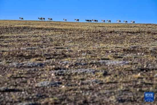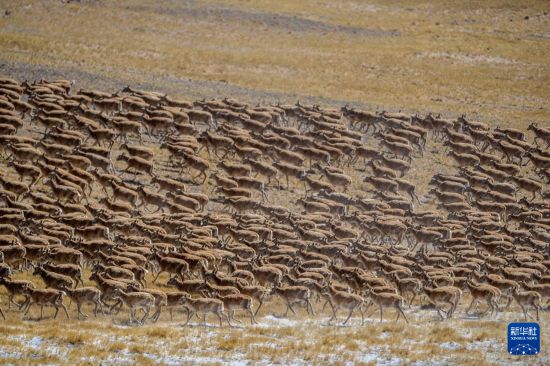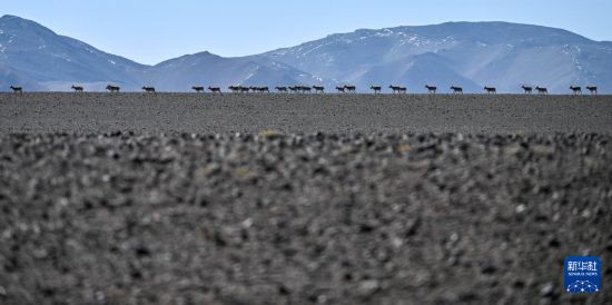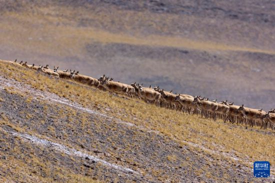 在羌塘國(guó)家級(jí)自然保護(hù)區(qū)核心區(qū)拍攝的遷徙中的雌性藏羚羊群(6月8日攝)。新華社記者 旦增尼瑪曲珠 攝