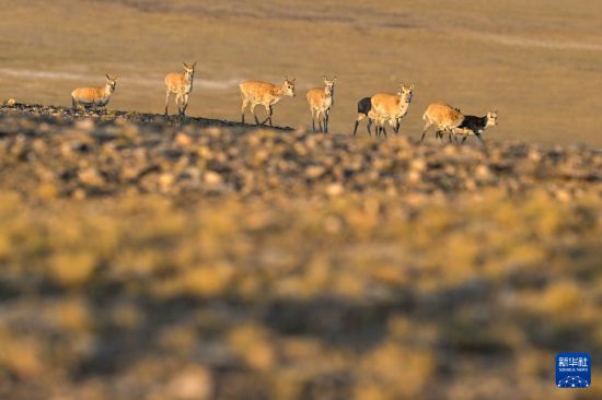 在羌塘國(guó)家級(jí)自然保護(hù)區(qū)核心區(qū)拍攝到的雄性和亞成體雌性藏羚羊(6月9日攝)。新華社記者 旦增尼瑪曲珠 攝