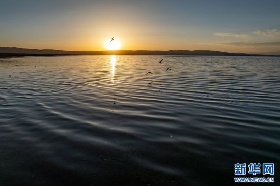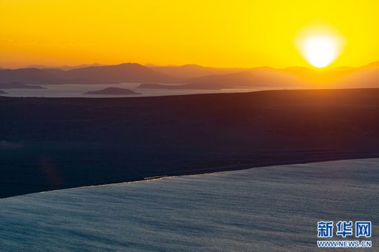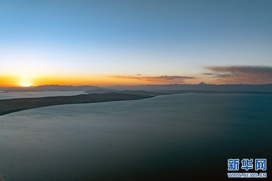 夕陽下的瑪旁雍錯(6月9日攝,無人機照片)。新華網 旦增努布 攝