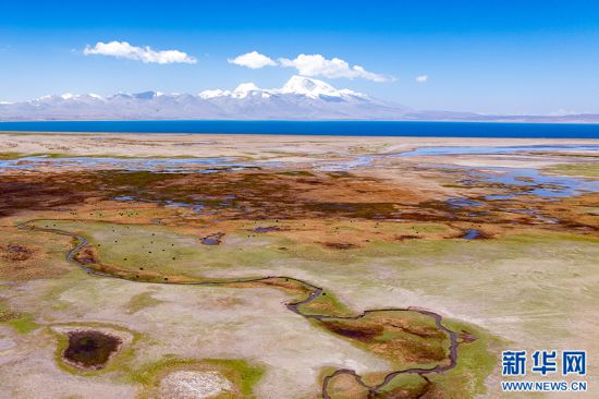 遠處的瑪旁雍錯與綠意漸濃的濕地(6月9日攝,無人機照片)。新華網 旦增努布 攝