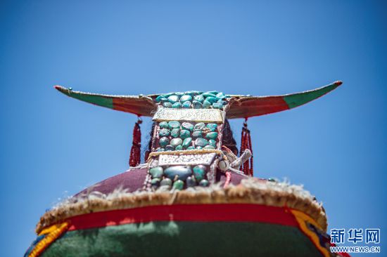 圖為裝點(diǎn)綠松石的普蘭服飾頭飾(6月10日攝)。新華網(wǎng) 旦增努布 攝