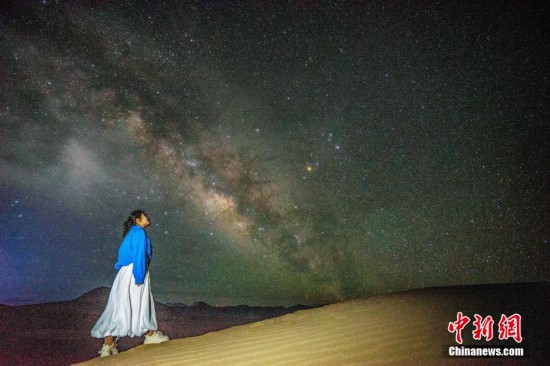 西藏阿里暗夜公園位于西藏自治區(qū)阿里地區(qū),海拔4200米,占地2500平方公里。這里集天文觀測(cè)、星空體驗(yàn)與旅游服務(wù)于一體。近日,隨著當(dāng)?shù)剡M(jìn)入觀星季,攝影愛(ài)好者在這里拍攝捕捉到了壯麗的銀河景觀。圖為6月20日晚,游客在西藏阿里暗夜公園與銀河“合影”。曹枝清 攝
