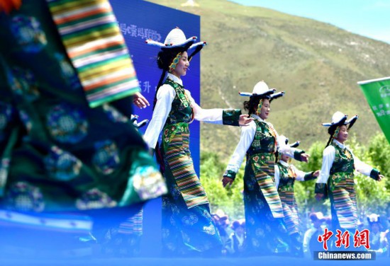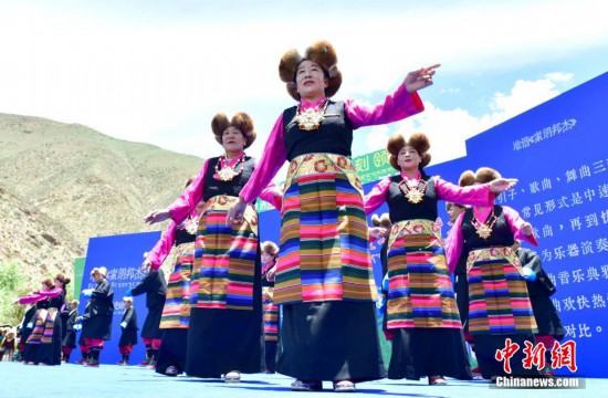 6月28日,拉薩首屆林卡囊瑪堆諧大賽在達(dá)孜區(qū)舉辦。現(xiàn)場,經(jīng)過前期海選入圍的19支隊伍依次上臺競技。囊瑪和堆諧,合稱囊瑪堆諧,是西藏民間歌舞發(fā)展到較高層次、集歌舞樂為一體的珍貴傳統(tǒng)文化藝術(shù)遺產(chǎn),深受當(dāng)?shù)孛癖姷南矏叟c追捧。圖為首屆林卡囊瑪堆諧大賽比賽現(xiàn)場。