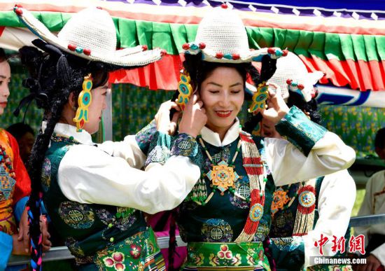 6月28日,拉薩首屆林卡囊瑪堆諧大賽在達(dá)孜區(qū)舉辦?,F(xiàn)場,經(jīng)過前期海選入圍的19支隊伍依次上臺競技。囊瑪和堆諧,合稱囊瑪堆諧,是西藏民間歌舞發(fā)展到較高層次、集歌舞樂為一體的珍貴傳統(tǒng)文化藝術(shù)遺產(chǎn),深受當(dāng)?shù)孛癖姷南矏叟c追捧。圖為首屆林卡囊瑪堆諧大賽比賽現(xiàn)場,參賽隊伍正在整理妝容。