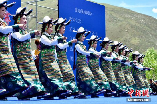 6月28日,拉薩首屆林卡囊瑪堆諧大賽在達(dá)孜區(qū)舉辦?,F(xiàn)場,經(jīng)過前期海選入圍的19支隊伍依次上臺競技。囊瑪和堆諧,合稱囊瑪堆諧,是西藏民間歌舞發(fā)展到較高層次、集歌舞樂為一體的珍貴傳統(tǒng)文化藝術(shù)遺產(chǎn),深受當(dāng)?shù)孛癖姷南矏叟c追捧。圖為首屆林卡囊瑪堆諧大賽比賽現(xiàn)場。