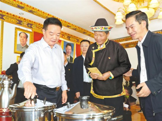 2024年巴宜區(qū)巴吉村集體經(jīng)濟(jì)收入突破1000萬元,年人均可支配收入6萬余元,是西藏幸福小康村的一個典型代表。王君正來到這里詳細(xì)了解村歷史沿革,聽取基層黨建引領(lǐng)鄉(xiāng)村振興等情況介紹,察看鄉(xiāng)村旅游項目。漫步依舍莊園,碧空如洗、花草搖曳,一派盎然生機(jī)。王君正指出,要充分發(fā)揮基層黨支部戰(zhàn)斗堡壘作用,宣傳黨的主張、貫徹黨的決定、領(lǐng)導(dǎo)基層治理、團(tuán)結(jié)動員群眾、推動改革發(fā)展,做強(qiáng)鄉(xiāng)村富民產(chǎn)業(yè),帶動群眾持續(xù)增收,為鄉(xiāng)村發(fā)展注入源源不斷的動力,推進(jìn)鄉(xiāng)村全面振興?!捌咭弧奔磳⒌絹恚蹙霊艨赐繂柣鶎永宵h員、全國民族團(tuán)結(jié)先進(jìn)個人格桑旺久。敞亮的三層樓房,精致的藏式家具,在格桑旺久家,王君正和一家人圍坐在客廳聊家常:“你是優(yōu)秀黨員、優(yōu)秀干部,長期以來帶領(lǐng)群眾勤勞致富,為黨和國家事業(yè)作出了積極貢獻(xiàn)。”王君正向格桑旺久并通過他向全區(qū)廣大黨員致以節(jié)日問候和誠摯祝福,希望老黨員們發(fā)揮先鋒模范作用,發(fā)揚(yáng)黨的光榮傳統(tǒng)和優(yōu)良作風(fēng),引導(dǎo)年輕黨員接續(xù)奮斗,把家園建設(shè)得更加美好,讓老百姓的日子更加幸福。