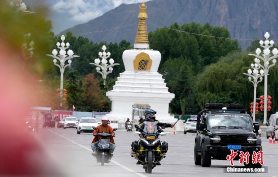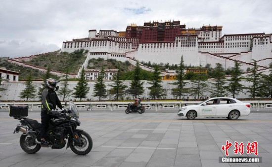 7月3日,摩旅愛好者行駛在拉薩街頭。隨著暑期旅游旺季的到來,進藏自駕游成為旅行愛好者的熱門選擇。房車愛好者、摩旅愛好者選擇自駕抵達拉薩,專程途經(jīng)布達拉宮打卡。中新社記者 李林 攝
