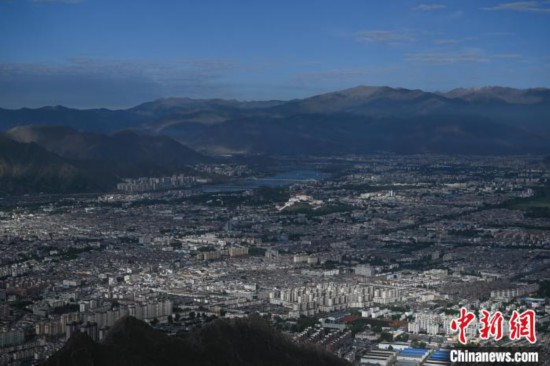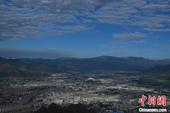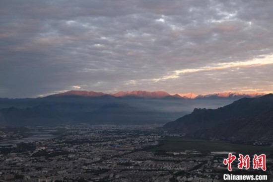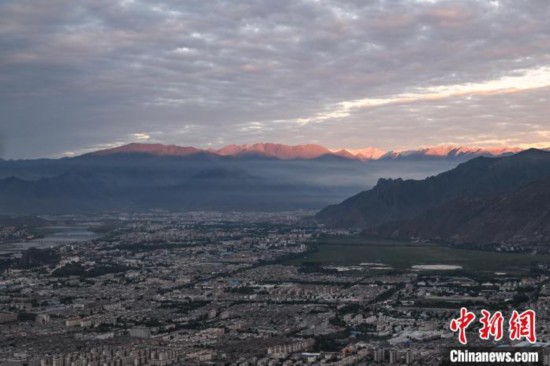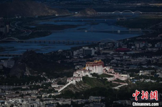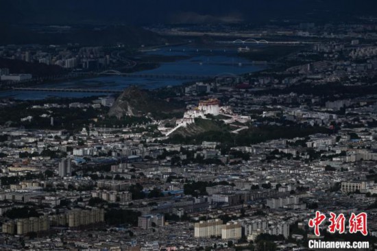 7月5日清晨,西藏拉薩市在薄霧中朦朧蘇醒,天際線泛起粉紫色霞光。布達(dá)拉宮在朝陽(yáng)的映照下美景如畫。中新社記者 貢嘎來松 攝