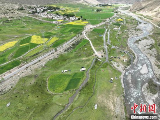 圖為市民在楚布溝里“過林卡”。(無人機照片)中新社記者 貢嘎來松 攝