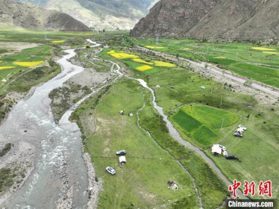 7月5日,西藏拉薩市風(fēng)和日麗,宜人周末里,市民紛紛前往近郊“過林卡”。在堆龍德慶區(qū)古榮鎮(zhèn)楚布溝,帳篷林立,歡聲笑語不斷。人們圍坐野餐,享受美食,伴著高原美景談天歌唱,孩童嬉戲奔跑,在自然中放松身心,延續(xù)傳統(tǒng)休閑樂趣 。圖為市民在楚布溝里“過林卡”。(無人機照片)中新社記者 貢嘎來松 攝
