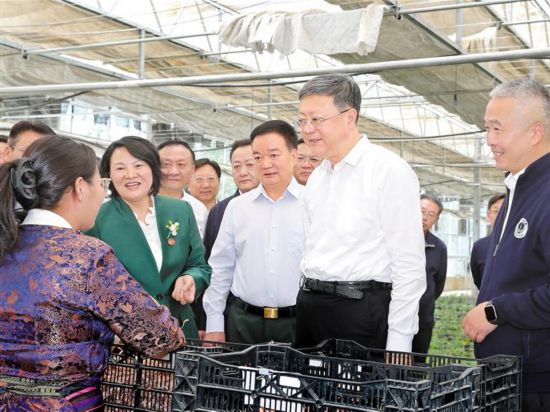 來到薩迦縣國家現(xiàn)代農(nóng)業(yè)產(chǎn)業(yè)園,溫室大棚內(nèi)作物長勢良好,一派生機(jī)盎然。近年來,在自治區(qū)黨委的大力推動下,上海市援藏力量主動作為,助力當(dāng)?shù)卮罅Πl(fā)展高原特色農(nóng)業(yè),不斷拓寬群眾增收渠道。代表團(tuán)走進(jìn)產(chǎn)業(yè)園,聽取高原藜麥種源科技和產(chǎn)業(yè)發(fā)展、藏紅花種植技術(shù)創(chuàng)新和產(chǎn)業(yè)幫扶情況介紹,察看相關(guān)產(chǎn)品展示,與園區(qū)、企業(yè)負(fù)責(zé)人和科研團(tuán)隊(duì)深入交流,就進(jìn)一步推進(jìn)高寒地區(qū)現(xiàn)代農(nóng)業(yè)全產(chǎn)業(yè)鏈高質(zhì)量發(fā)展進(jìn)行討論。兩地同志表示,要立足雙方優(yōu)勢,把上海資金、管理、科技、人才等優(yōu)勢與西藏資源、區(qū)位等優(yōu)勢相結(jié)合,進(jìn)一步做強(qiáng)特色產(chǎn)業(yè)、打響高原品牌,在以銷定產(chǎn)、產(chǎn)品推廣等方面開展深度合作,促進(jìn)西藏優(yōu)質(zhì)資源變成好產(chǎn)品、走向大市場、賣出好價錢,有效帶動群眾就業(yè)增收,讓各族群眾錢包鼓起來、日子好起來。