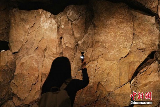 7月15日,在位于西藏拉薩的西藏博物館,觀眾拍攝復原的阿里日姆棟巖畫。據了解,西藏博物館設有基本陳列《雪域長歌—西藏歷史文化展》《離太陽最近的人—西藏民俗文化展》,充分展示西藏地區(qū)歷史發(fā)展進程與文化面貌。中新社記者 張祥毅 攝
