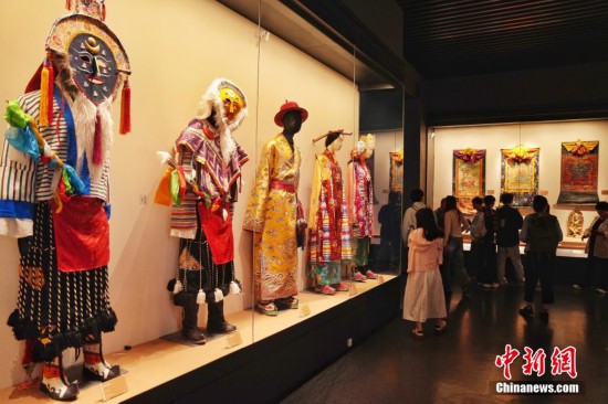 7月15日,在位于西藏拉薩的西藏博物館,藏戲服飾吸引觀眾。據了解,西藏博物館設有基本陳列《雪域長歌—西藏歷史文化展》《離太陽最近的人—西藏民俗文化展》,充分展示西藏地區(qū)歷史發(fā)展進程與文化面貌。中新社記者 張祥毅 攝