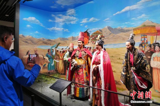 7月15日,在位于西藏拉薩的西藏博物館,文成公主進藏的《柏海迎親》塑像吸引觀眾。據了解,西藏博物館設有基本陳列《雪域長歌—西藏歷史文化展》《離太陽最近的人—西藏民俗文化展》,充分展示西藏地區(qū)歷史發(fā)展進程與文化面貌。中新社記者 張祥毅 攝