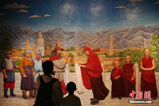 7月15日,在位于西藏拉薩的西藏博物館,觀眾參觀“涼州會談”場景,“涼州會談”結束了吐蕃地方政權對西藏的長期分治局面,順應了國家統(tǒng)一的歷史潮流。據了解,西藏博物館設有基本陳列《雪域長歌—西藏歷史文化展》《離太陽最近的人—西藏民俗文化展》,充分展示西藏地區(qū)歷史發(fā)展進程與文化面貌。中新社記者 張祥毅 攝