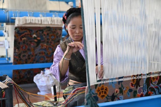 藏毯編織車間內(nèi),珍拉在編織藏毯。新華社記者 李鑫 攝