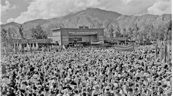 圖為拉薩干部群眾慶祝西藏自治區(qū)正式成立(1965年攝)。