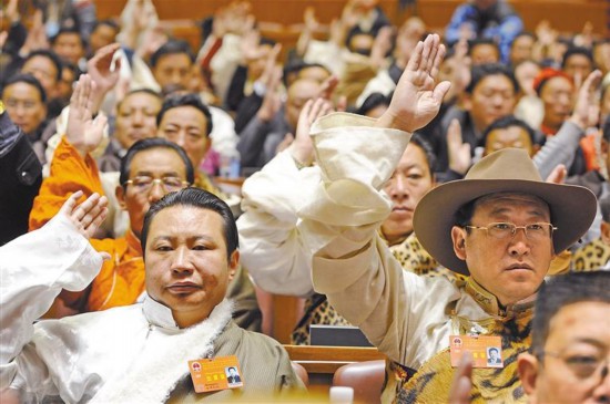 圖為西藏自治區(qū)九屆人大二次會議上,代表們舉手表決一致通過關(guān)于設(shè)立百萬農(nóng)奴解放紀(jì)念日的決定(2009年攝)。