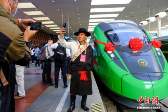 資料圖為2021年6月25日,西藏拉林鐵路開(kāi)通運(yùn)營(yíng),民眾在拉薩火車站與復(fù)興號(hào)拍照留念。當(dāng)日,斯朗旺扎系首發(fā)司機(jī)。中新網(wǎng)記者 江飛波 攝