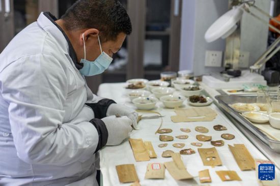 5月25日,布達(dá)拉宮貝葉經(jīng)實(shí)驗(yàn)性修復(fù)小組實(shí)驗(yàn)室工作人員在對(duì)貝葉進(jìn)行處理。新華社記者 旦增尼瑪曲珠 攝
