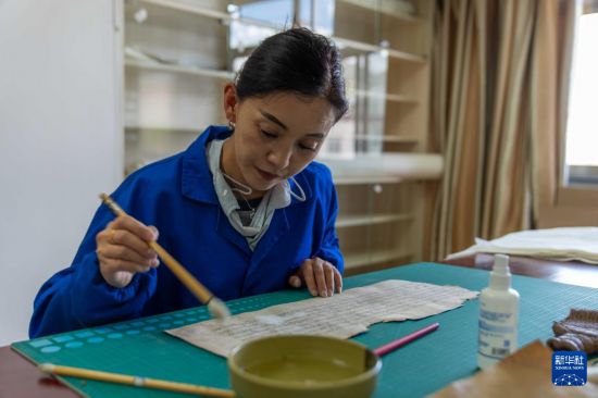 8月13日,西藏自治區(qū)古籍保護(hù)中心古籍修復(fù)員次仁央宗在對(duì)古籍進(jìn)行除霉。新華社記者 旦增尼瑪曲珠 攝