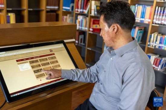 8月13日,西藏自治區(qū)圖書館副館長(zhǎng)邊巴次仁在介紹數(shù)據(jù)庫(kù)中的藏文古籍。新華社記者 旦增尼瑪曲珠 攝