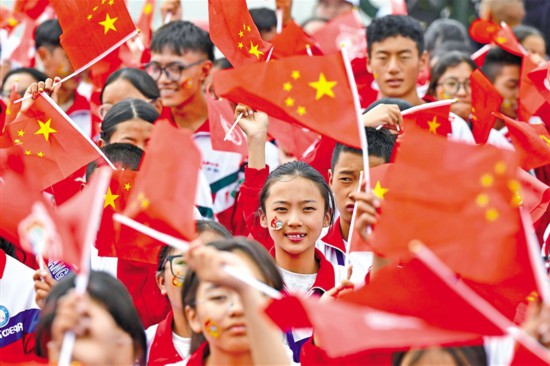 群眾在慶祝大會(huì)現(xiàn)場揮舞旗幟。新華社記者 申宏 攝
