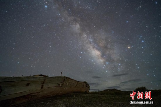 西藏山南羊卓雍錯(cuò)日托寺,因?yàn)楹0胃?、遠(yuǎn)離城市光污染,是理想的觀星之地。近日,海拔4400多米的寺廟夜空清澈,銀河清晰可見,璀璨星辰與羊卓雍錯(cuò)相映成趣,吸引游客和攝影愛好者觀星拍攝。圖為游客在羊卓雍錯(cuò)日托寺附近與銀河“打卡”。江飛波 攝