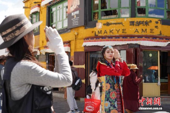圖為來自烏克蘭的游客身著藏裝在八廓街拍照留念。中新社記者 貢嘎來松 攝