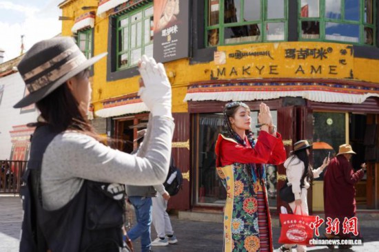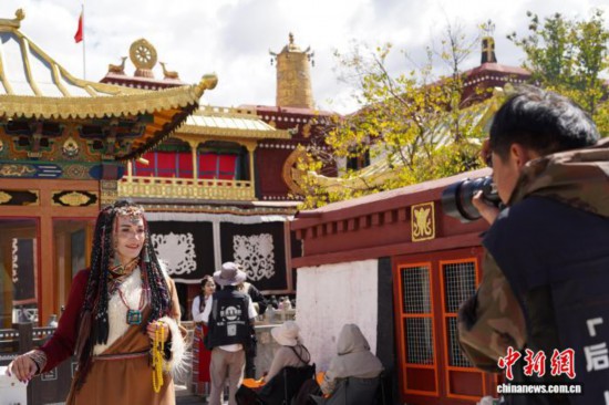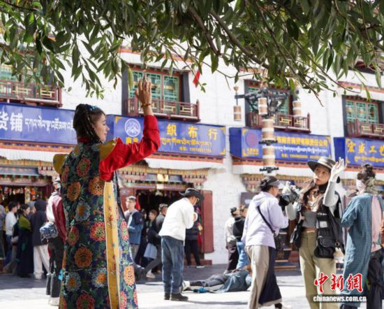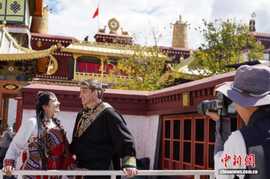 9月28日,西藏拉薩大昭寺、八廓街,來自意大利、烏克蘭、墨西哥等國(guó)的游客,身著色彩艷麗的藏族傳統(tǒng)服飾,在金頂紅墻的映襯下拍照留念。圖為來自意大利的游客身著藏裝在大昭寺廣場(chǎng)拍照留念。中新社記者 貢嘎來松 攝