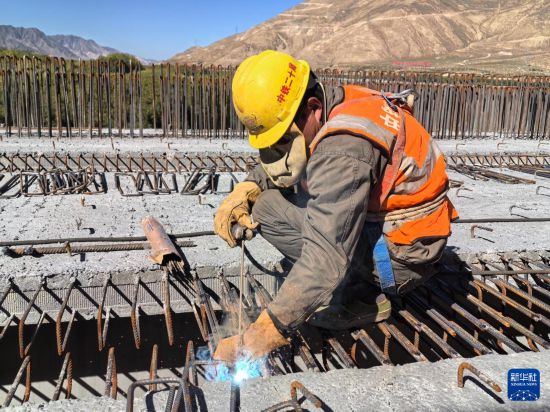 施工人員在薩熱路跨江大橋建設(shè)現(xiàn)場(chǎng)工作(10月13日攝)。新華社發(fā)(帥卿 攝)