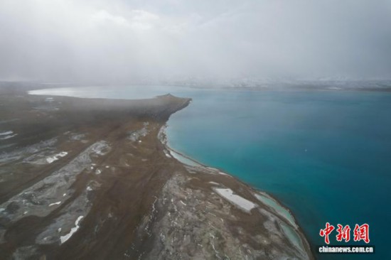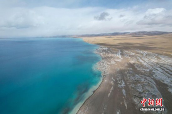 圖為10月9日,航拍視角下,美馬錯(cuò)湖水顏色漸次變化,遠(yuǎn)處雪山隱隱。江飛波 攝