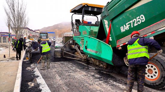 圖為工人正在給措美縣城巴爾林路鋪油。措美縣委宣傳部供圖