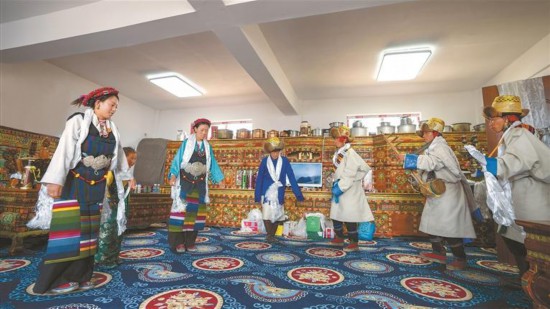 “康索”在加布村黨支部書記多吉的主持下開始,他為索朗頓珠全家一一獻(xiàn)上潔白的哈達(dá),并朗聲念誦吉祥祝詞:“在黨的光輝照耀下,我們這片曾經(jīng)受傷的土地重新煥發(fā)勃勃生機(jī)。愿家宅平安,納福迎祥,愿這水缸永遠(yuǎn)滿盈,愿這爐火永遠(yuǎn)旺盛!”