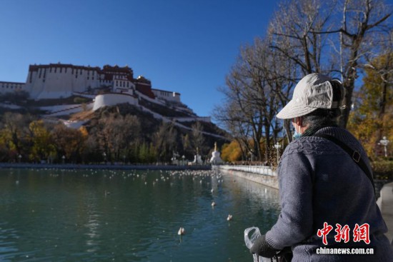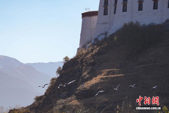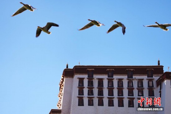 11月17日,西藏拉薩迎來大批越冬候鳥。拉薩河、宗角祿康公園等地,成為了它們的棲息天堂。在宗角祿康公園內(nèi),赤麻鴨、斑頭雁成群結(jié)隊,時而低頭覓食,時而水中嬉戲。它們的身影引得市民和游客紛紛駐足觀賞、拍照留念,構(gòu)成了一幅人與自然和諧共生的美麗畫卷。圖為斑頭雁與布達拉宮同框。貢確 攝