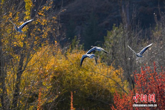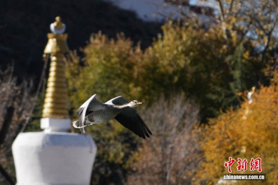 11月17日,西藏拉薩迎來大批越冬候鳥。拉薩河、宗角祿康公園等地,成為了它們的棲息天堂。在宗角祿康公園內(nèi),赤麻鴨、斑頭雁成群結(jié)隊,時而低頭覓食,時而水中嬉戲。它們的身影引得市民和游客紛紛駐足觀賞、拍照留念,構(gòu)成了一幅人與自然和諧共生的美麗畫卷。圖為斑頭雁從宗角祿康公園上方飛過。貢確 攝