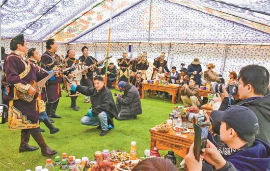 “我們的烤藏香豬外皮酥脆、肉質(zhì)鮮嫩,來嘗嘗吧?!薄笆侂u、石鍋雞,先喝湯、再吃雞?!薄扒囡钟筒瑁赓M(fèi)品嘗啦?!薄げ夹履甑目鞓穭艃涸谟谶@一聲聲吆喝聲中,在于熱鬧的氛圍,在于每一個(gè)人滿足的笑臉。