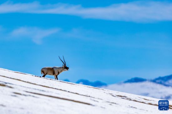 一頭雄性藏羚羊在羌塘國家級(jí)自然保護(hù)區(qū)的雪原上嗥叫,呼喚伴侶,挑戰(zhàn)對(duì)手(11月30日攝)。新華社記者 姜帆 攝