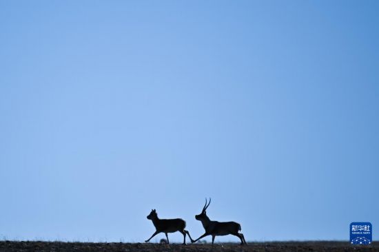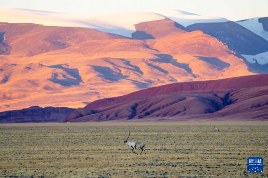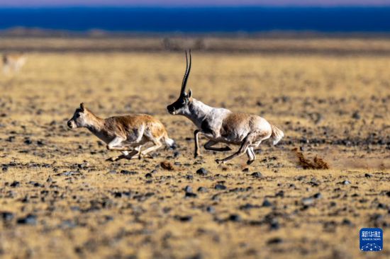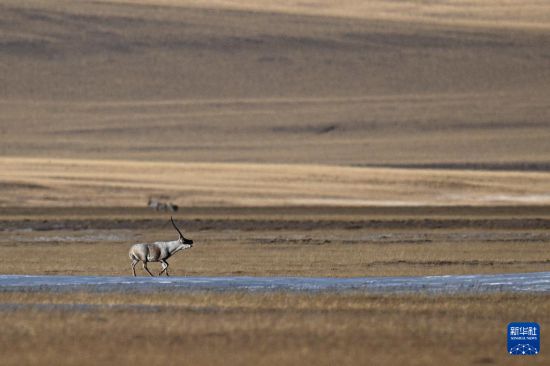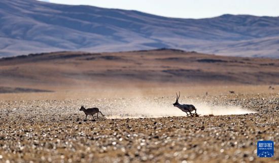 一頭雄性藏羚羊在羌塘國家級(jí)自然保護(hù)區(qū)的草原上追逐雌性藏羚羊(12月3日攝)。新華社記者 姜帆 攝