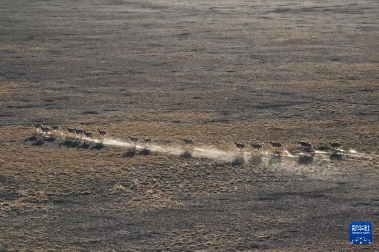 在阿爾金山國家級(jí)自然保護(hù)區(qū),一群藏羚羊在草原上奔跑(無人機(jī)照片,12月7日攝)。新華社記者 辛悅衛(wèi) 攝