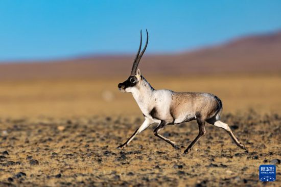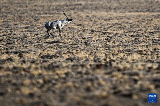 一頭雄性藏羚羊在羌塘國家級(jí)自然保護(hù)區(qū)的草原上奔跑(12月4日攝)。新華社記者 姜帆 攝