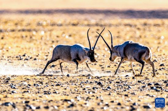 兩頭雄性藏羚羊在羌塘國家級(jí)自然保護(hù)區(qū)爭奪交配權(quán)(12月3日攝)。新華社記者 姜帆 攝