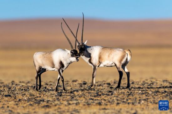 兩頭雄性藏羚羊在羌塘國家級(jí)自然保護(hù)區(qū)貼面嗥叫示威,準(zhǔn)備爭斗(12月1日攝)。新華社記者 郭昱 攝