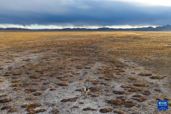在阿爾金山國家級(jí)自然保護(hù)區(qū),一只雄性藏羚羊在覓食(12月5日攝,無人機(jī)照片)。新華社記者 辛悅衛(wèi) 攝
